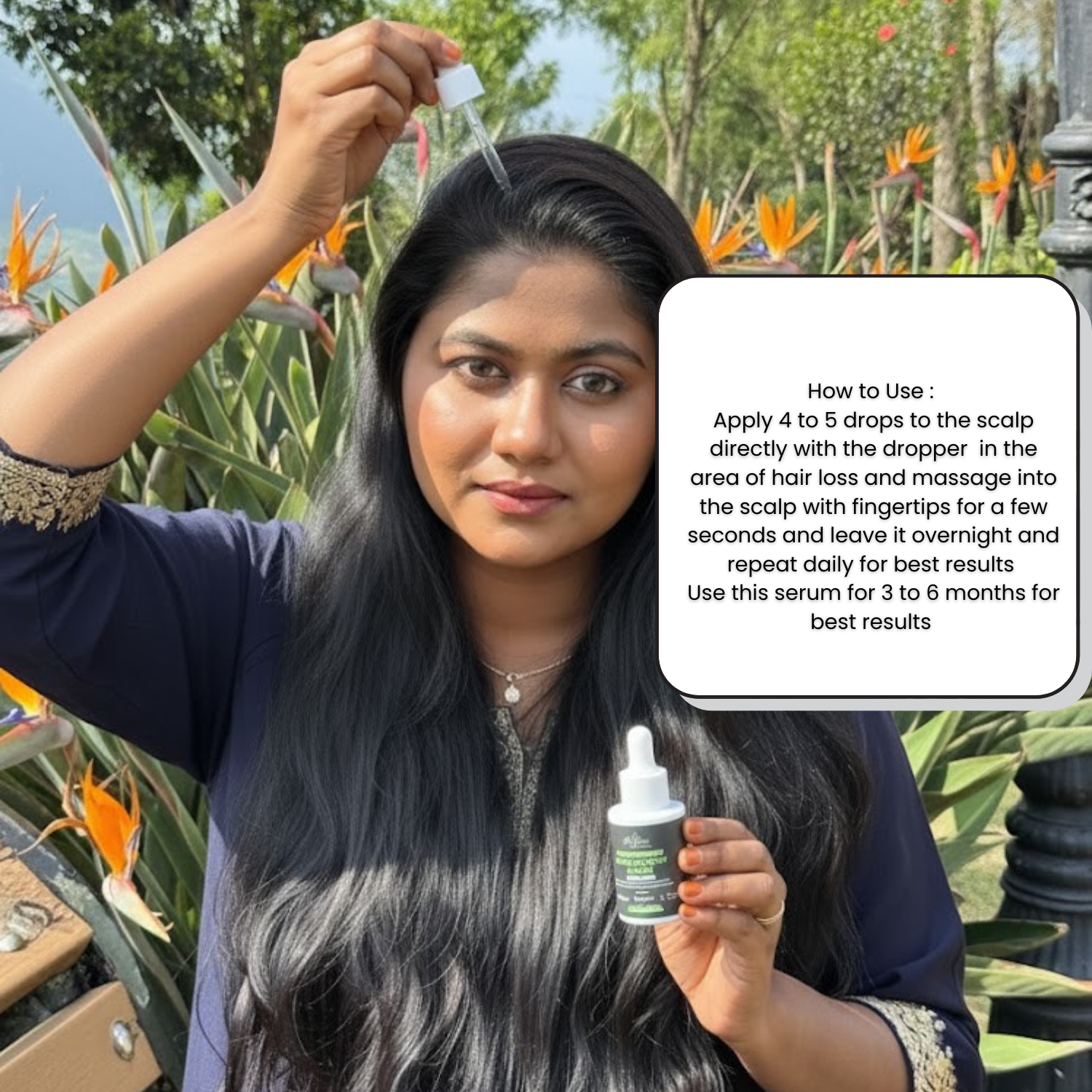 Apply 4–5 drops directly to the scalp in the area of thinning or hair loss using the dropper.